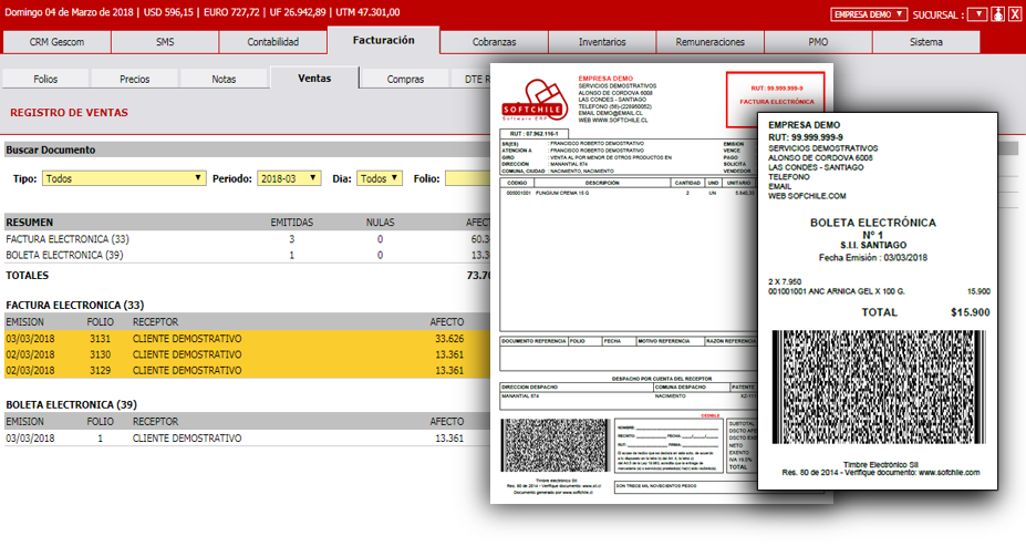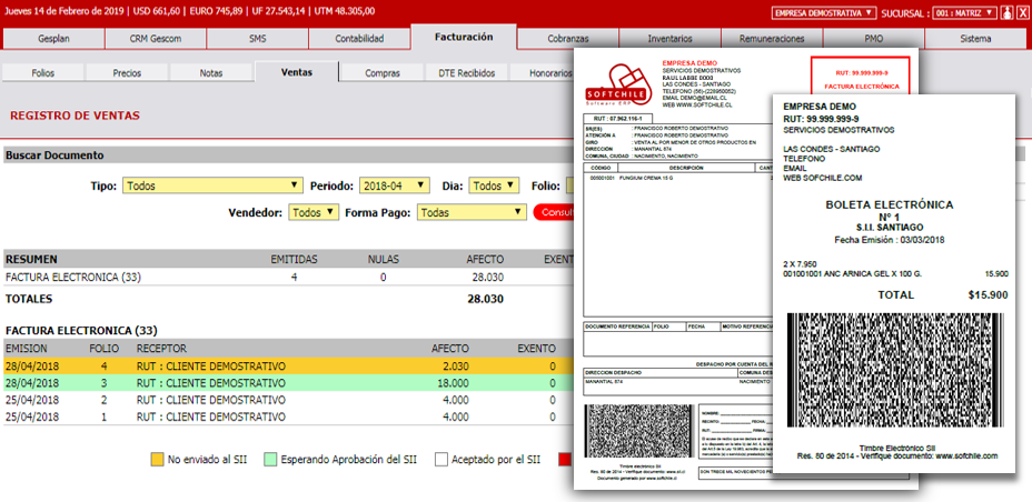 Emite facturas electrónicas, notas de crédito o débito y boletas electronicas libremente, sin límites mensuales. Los DTE's de tus proveedores son recibidos automáticamente por SoftChile ERP y podrás enviar su Aceptación o Rechazos directamente al SII, sin la necesidad de ingresar al sitio del SII. Consulta automática de la aprobación o rechazo de tus DTEs.