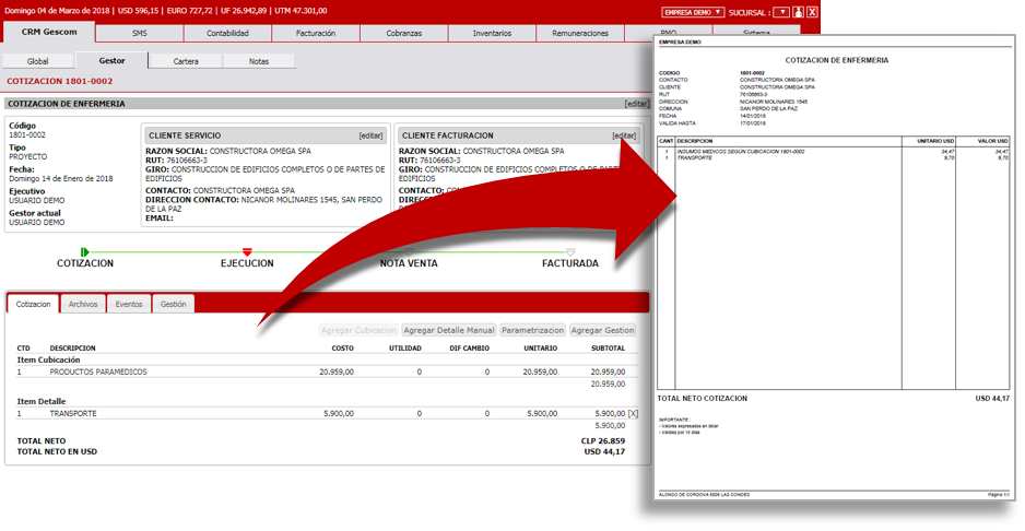 Cotiza de forma rápida y formal en 3 monedas: Peso, Dólar y UF. Envía cotizaciones en PDF a tus clientes y sigue su trazabilidad. Crea cotizaciones normales o de proyectos, crea cubicaciones, parametriza valores de cierre y formato. Controla a tus ejecutivos, revisa cuánto cotizan y cuánto venden. Otorga privilegios para enviar o recotizar.
