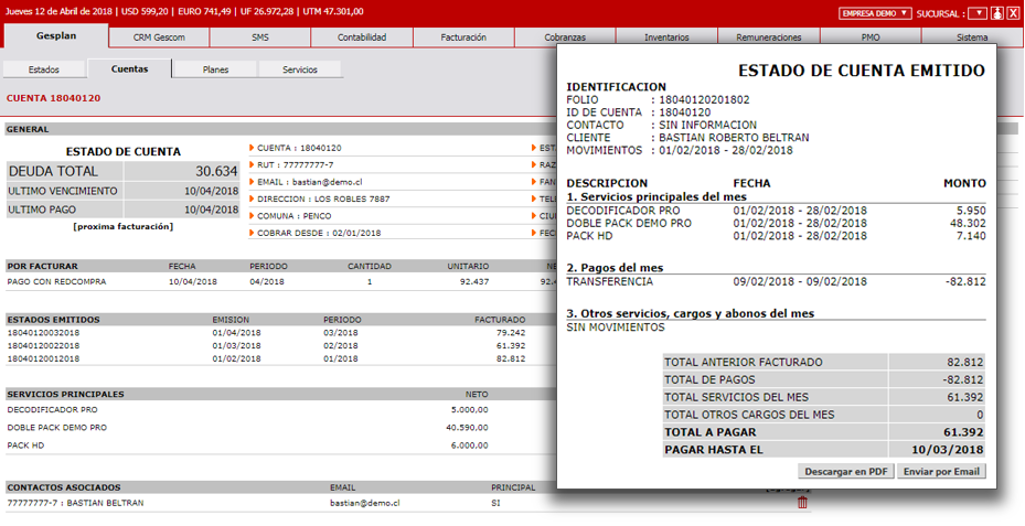 Controla fácilmente todas tus facturas pendientes de pago. Registra todas las gestiones de cobranza, llamados telefónicos, contactos y compromisos. Podrás conocer en tiempo real la morosidad de tus clientes, los abonos realizados por factura y sus formas de pago. También, gestiona tus obligaciones de pago a tus proveedores.