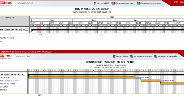Módulo exclusivo de SoftChile ERP que controla la Ejecución de Proyectos, los cuales agrupa en una Carta Gantt automática, compuesta por hitos, tareas y eventos. PMO muestra estados financieros por proyecto, comparando lo cotizado versus los gastos reales. Esto, gracias al control de Materiales, Horas Extra y registro de gastos y rendiciones.